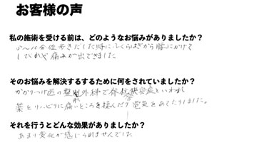 こんなに痛みがあっても治るものなのかしら?と思っていましたが、1回目の施術が終わって帰りには楽になっていました。やはりここに頼って良かったと思いました。先生を信じて良くなるまで続けようと思いました。